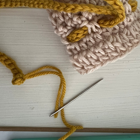 Cut yarn and secure. Thread pom pom tie through the spaces made in round 9. With the long tail, use a needle to weave ends into last stitch a few times to create a pom pom. Cut yarn and weave in ends.
